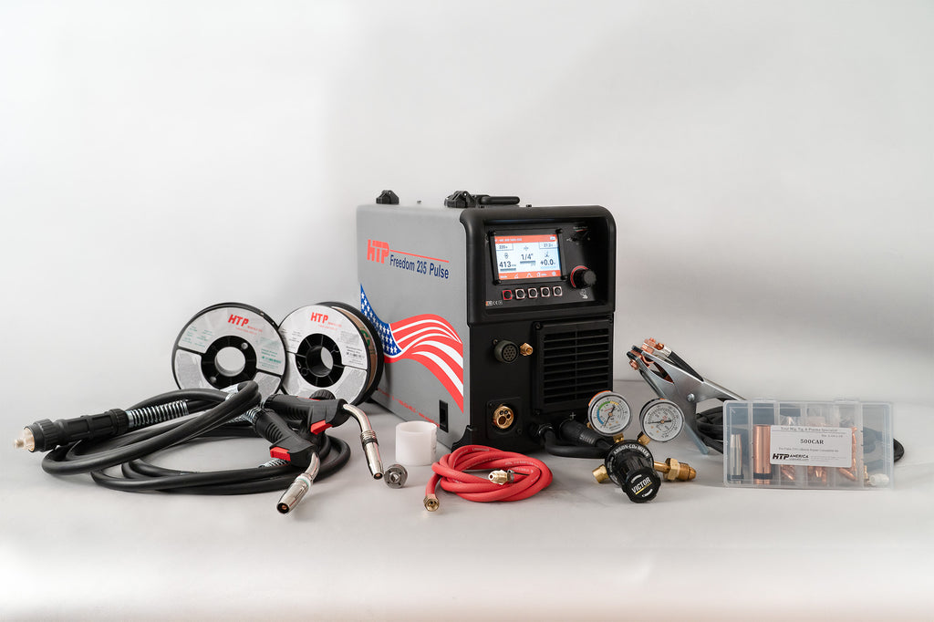 The HTP Freedom 235P —a multi-process machine capable of MIG, synergic MIG, synergic pulsed MIG, DC TIG, and Stick—offers a manual mode as well as pre programmed synergic programs, both with and without pulse, giving you the advantage of a virtually spatter free weld! Parameter selection on pulsed process welders can be complex, but the Freedom 235 P features synergic technology, making parameter selection more intuitive and automatic. In fact, the Freedom 235P, with its three-step process, makes setup a breeze and gets you welding in minutes—simply select your process, wire diameter, and material thickness during automated setup. The 8 square inch LCD featured on the Freedom 235P adds to setup simplicity by telling you which gas your application requires; the LCD also enables you to easily view and adjust your weld parameters.