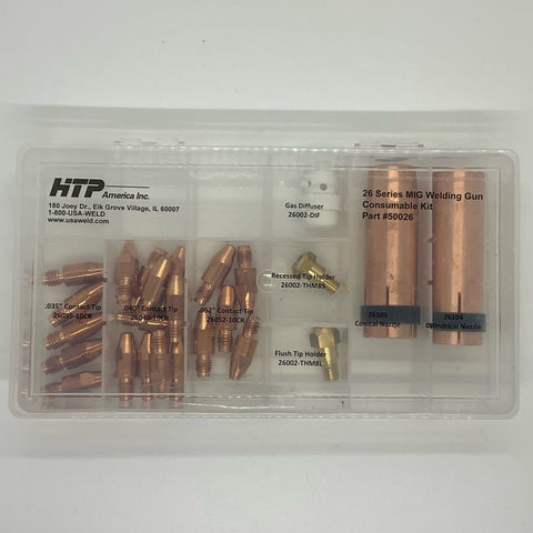 Consumable kit for the HTP® America 26 Series MIG welding gun used on the following HTP® America MIG welders: MTS 210, Pro Pulse™ 200, Pro Pulse™ 220 MTS, and Pro Pulse™ 300. Best of all, the parts come in a compartmentalized plastic box marked with permanent part numbers to make reordering easy. If you own or plan to purchase the MTS 210 or a Pro Pulse™ for welding aluminum, then this is the kit for you!